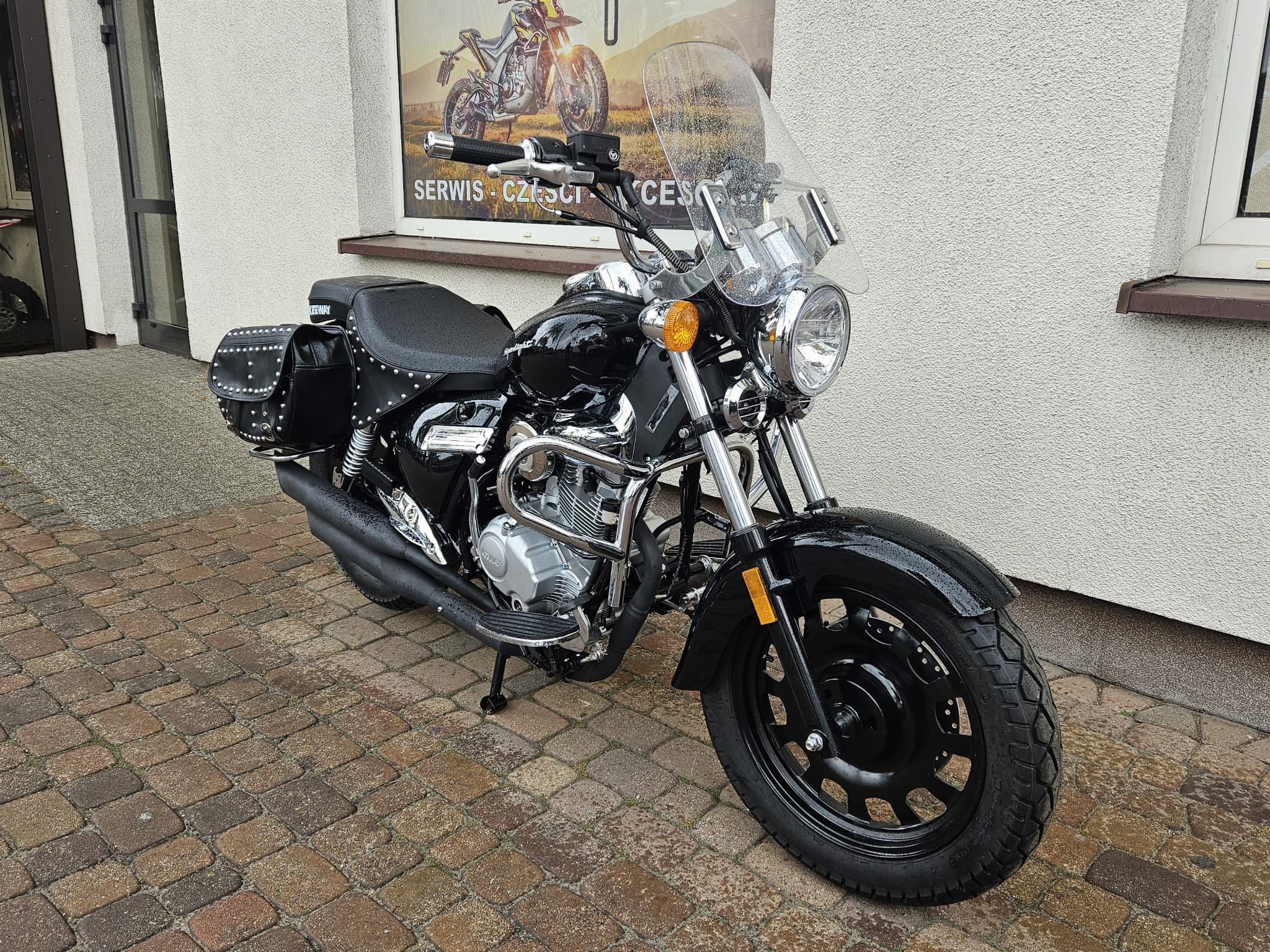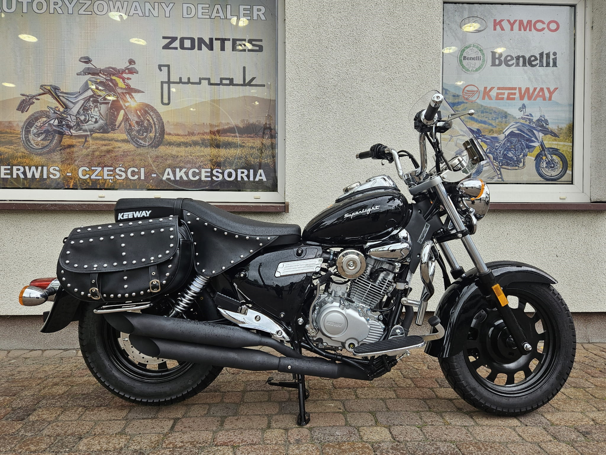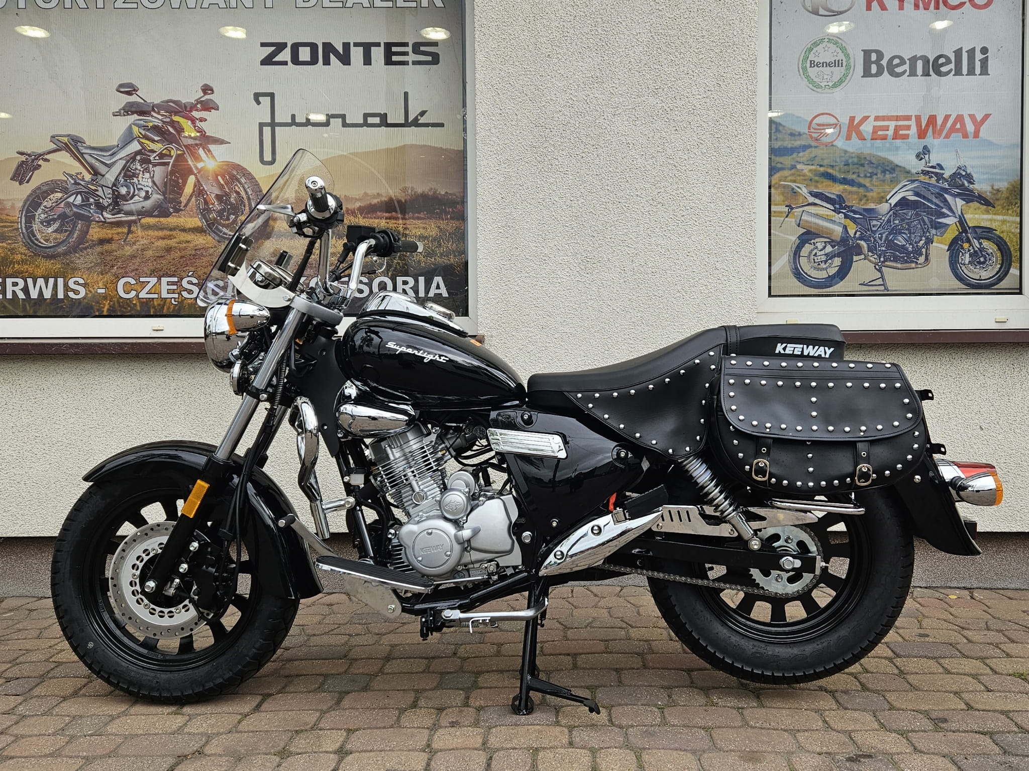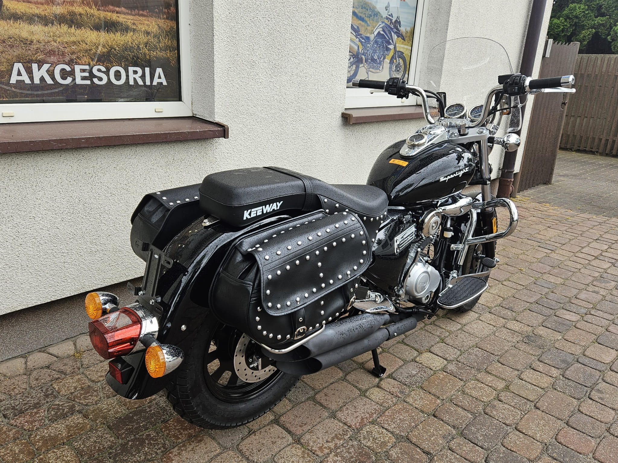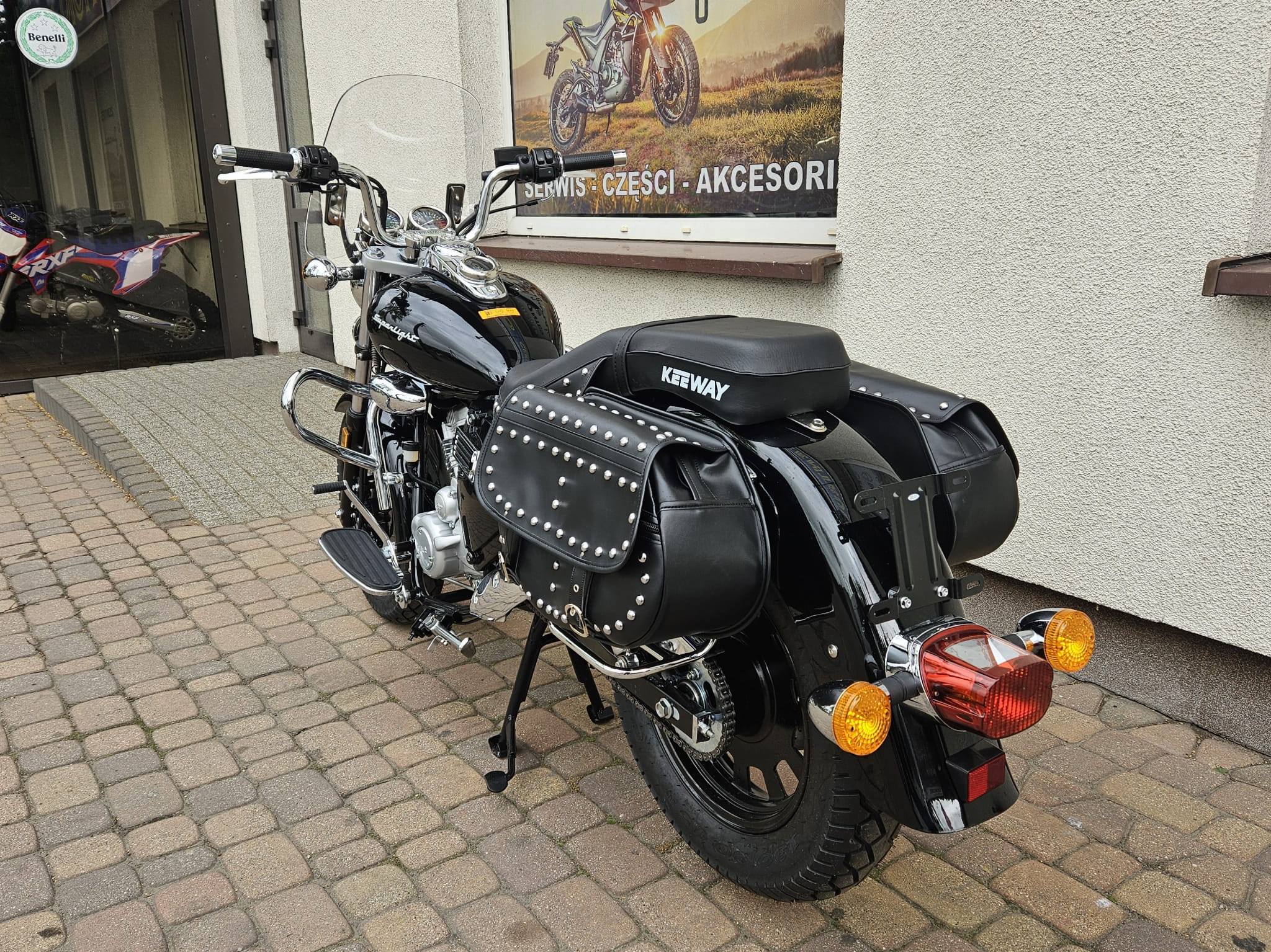 Błyszczące ozdobne nity i czarna skóra to nieodłączny element klasycznego stroju motocyklisty jak i dekoracji samego motocykla. Superlight ma tego pod dostatkiem: udekorowane nitami wiszące poły siodła i dwie duże boczne sakwy z ekologicznej skóry.