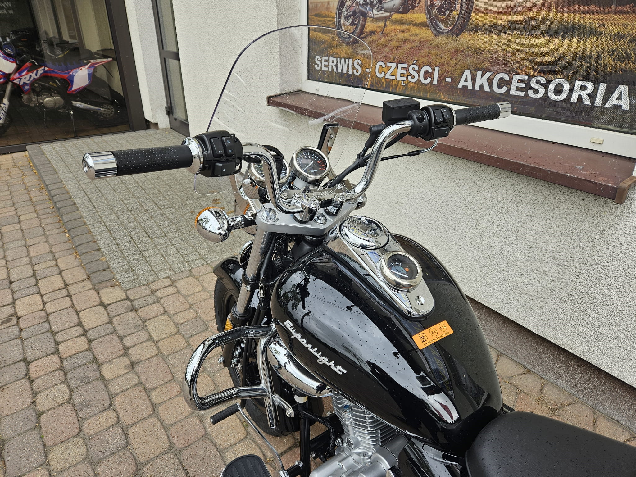 Duża przednia szyba w tej edycji Superlighta montowana jest standardowo. Daje w trasie skuteczną ochronę przed wiatrem i sprawia, że jazda jest przyjemna i bezpieczna. Jest też idealnym stylistycznym dopełnieniem do chromu, nitów i ekologicznej skóry.